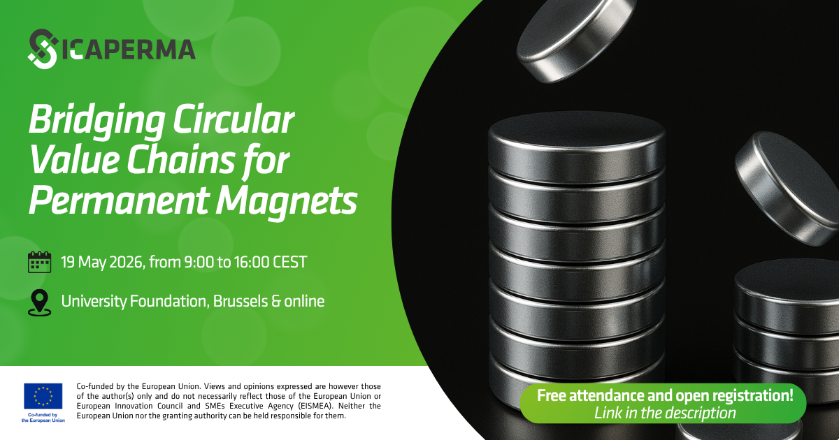 The “Bridging Circular Value Chains for Permanent Magnets” event will unite European policymakers, industry experts, researchers, and EU-funded projects to advance sustainable and circular value chains for rare earth and permanent magnets. Organized under the SICAPERMA (I3) project and in collaboration with PERMANENT (Horizon Europe) and REMHub, it seeks to enhance interregional cooperation and promote resilient, strategically autonomous European magnet value chains.