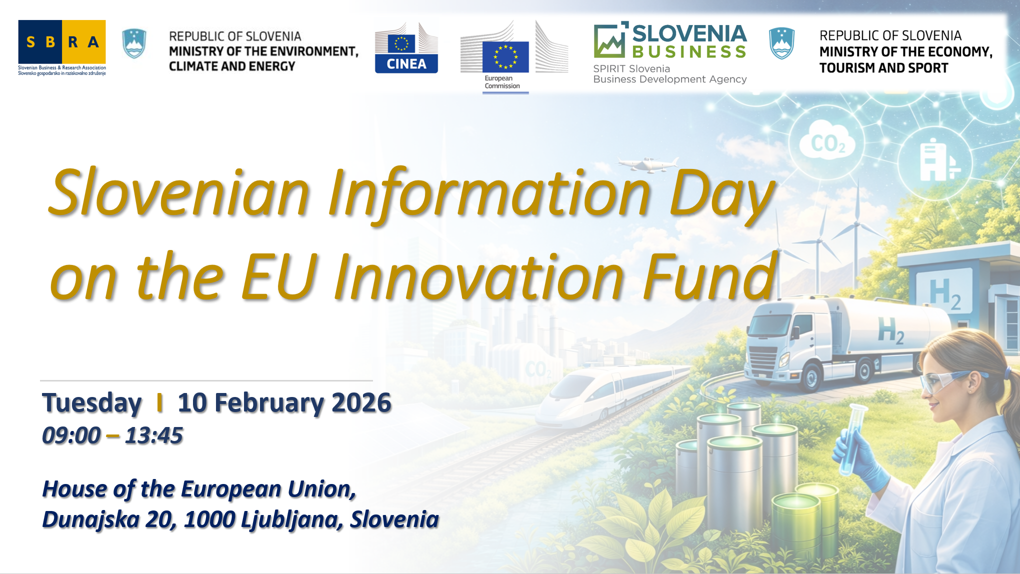 The Slovenian Business & Research Association (SBRA), in cooperation with the Ministry of the Environment, Climate and Energy, the EU agency CINEA, the European Commission, and the European Commission Representation in Slovenia, is co-organising the Slovenian Innovation Fund Info Day, which will take place on 10 February 2026 in Ljubljana, Slovenia. The event is intended for companies, research organisations, energy and industrial stakeholders, as well as all those considering submitting project proposals under the EU Innovation Fund calls.