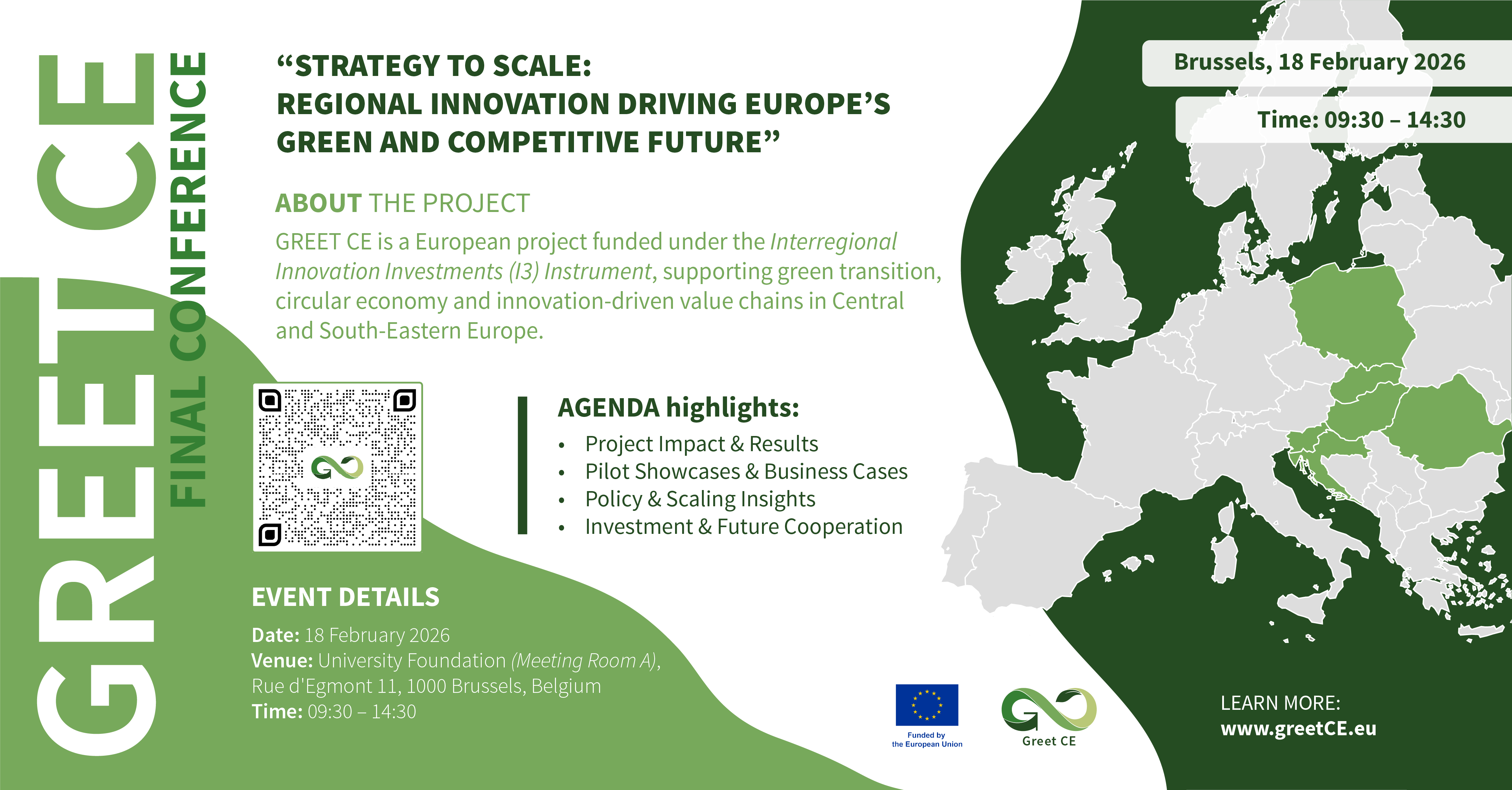 The Greet CE Final Project Conference, titled “Strategy to Scale: Regional innovation driving Europe’s green and competitive future,” presents the project’s circular economy pilots and innovations across sustainable agriculture, bio-based value chains, clean energy, renewable gases, and resource-efficient construction. The conference also highlights projects developed and supported within Greet CE, including digital energy tools, biofertilizers, and strategies for scaling impact. SME pitches showcase practical circular solutions: from waste-to-energy technologies and pyrolysis products to mycelium-based composites and sustainable insulation, accompanied by investor feedback to support market adoption. Together, these sessions demonstrate how regional innovation is shaping Europe’s green and competitive future.