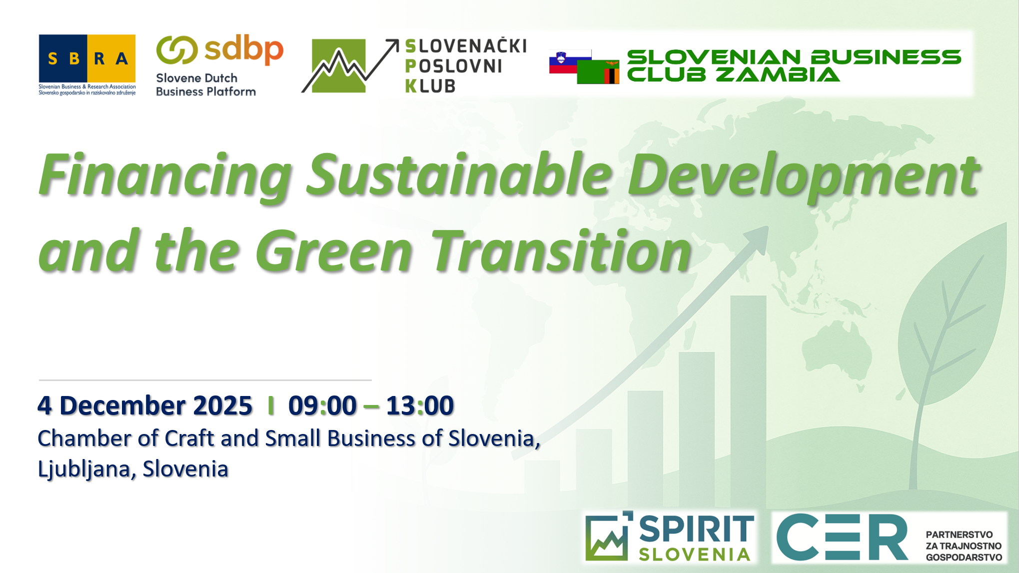 Sustainable development is no longer just a buzzword – it has become a reality that shapes both economic and social trends. It stands among the key priorities of the European Union. To explore this important topic, Slovenian business clubs from Belgium, the Netherlands, Serbia, and Zambia are organizing a concise business meeting dedicated to the financing of sustainable development. This time, we won’t be talking about sustainable projects themselves, but about how they are funded. In addition to non-repayable EU funds – a focus area of the Slovenian Business Club in Brussels – we’ll also discuss bank financing, related regulations, conditions, and practical experiences. The discussion will feature not only representatives from banks but also companies that deal with these challenges every day. We’ll also briefly introduce green bonds, which are becoming an increasingly important instrument for sustainable financing.