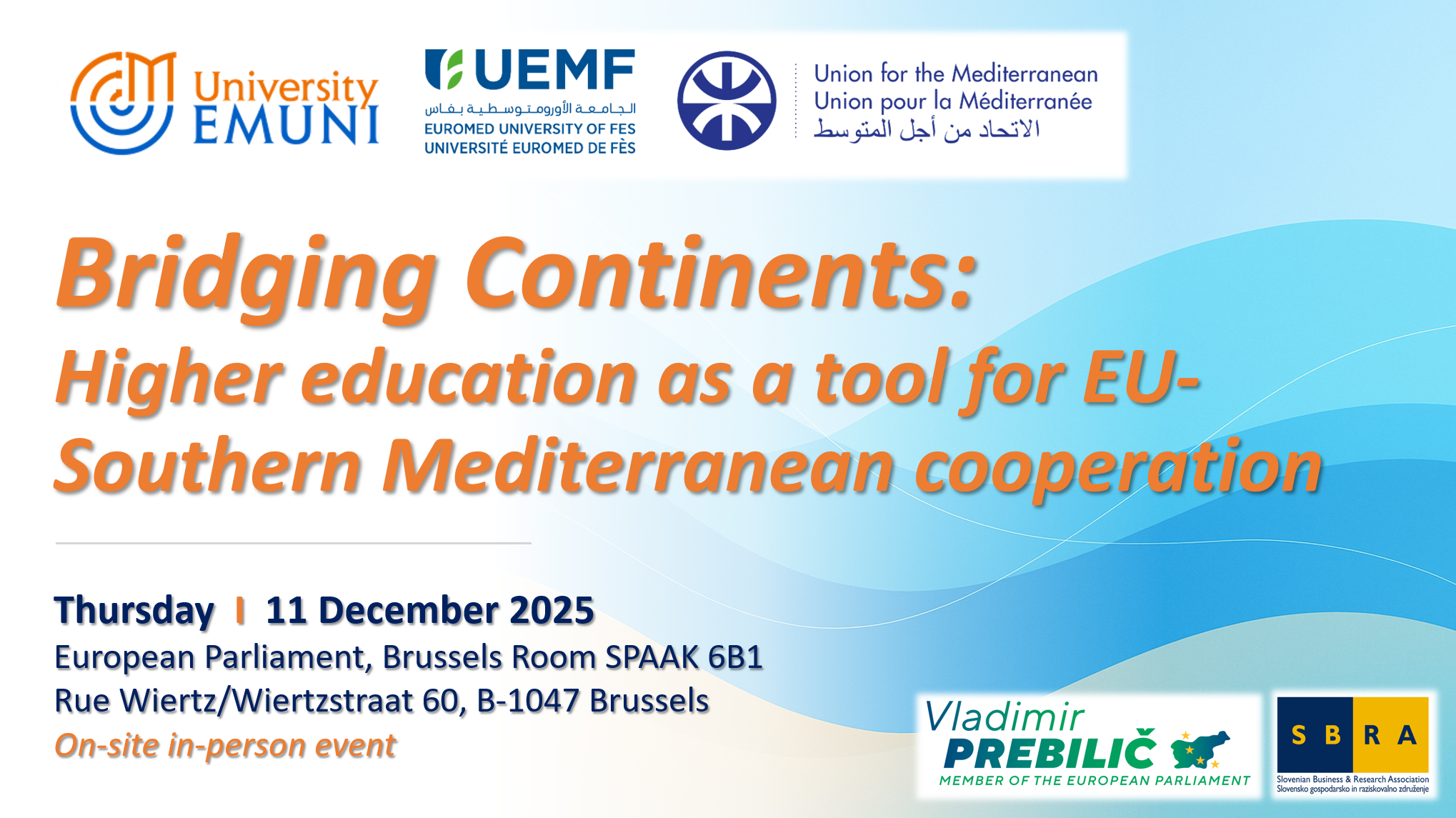 Ob skorajšnjem sprejetju novega pakta za Sredozemlje z veseljem vabita Evro-sredozemska univerza (EMUNI) in Evro-sredozemska univerza v Fesu (UEMF), v sodelovanju z bruseljskim Slovenskem gospodarskem in raziskovalnem združenju (SBRA), na konferenco, ki bo 11. decembra 2025 v Evropskem parlamentu v Bruslju, s podporo Unije za Sredozemlje. Dogodek z naslovom »Povezovanje kontinentov: visoko šolstvo kot orodje za sodelovanje med EU in južnim Sredozemljem« bo raziskoval, kako lahko visoko šolstvo prispeva k izvajanju pakta, krepi regionalna zavezništva ter spodbuja strukturiran dialog med EU in južnim Sredozemljem. V čast nam je, da je evropska komisarka za Sredozemlje, ga. Dubravka Šuica, potrdila svojo udeležbo kot osrednja govornica. Konferenca, ki bo povezala vodilne oblikovalce politik, institucije in deležnike z obeh bregov Sredozemlja, se bo osredotočila na to, kako lahko akademska izmenjava preoblikuje skupne izzive v priložnosti za rast in sodelovanje.